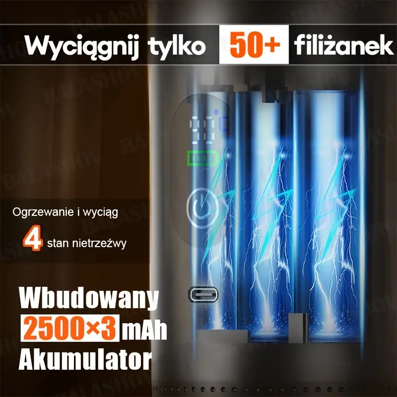 Ekspres jest wyposażony w 3 baterie o łącznej pojemności 7500 mAh co zapewni zaparzenie minimum 4 kubków kawy bez konieczności ładowania.